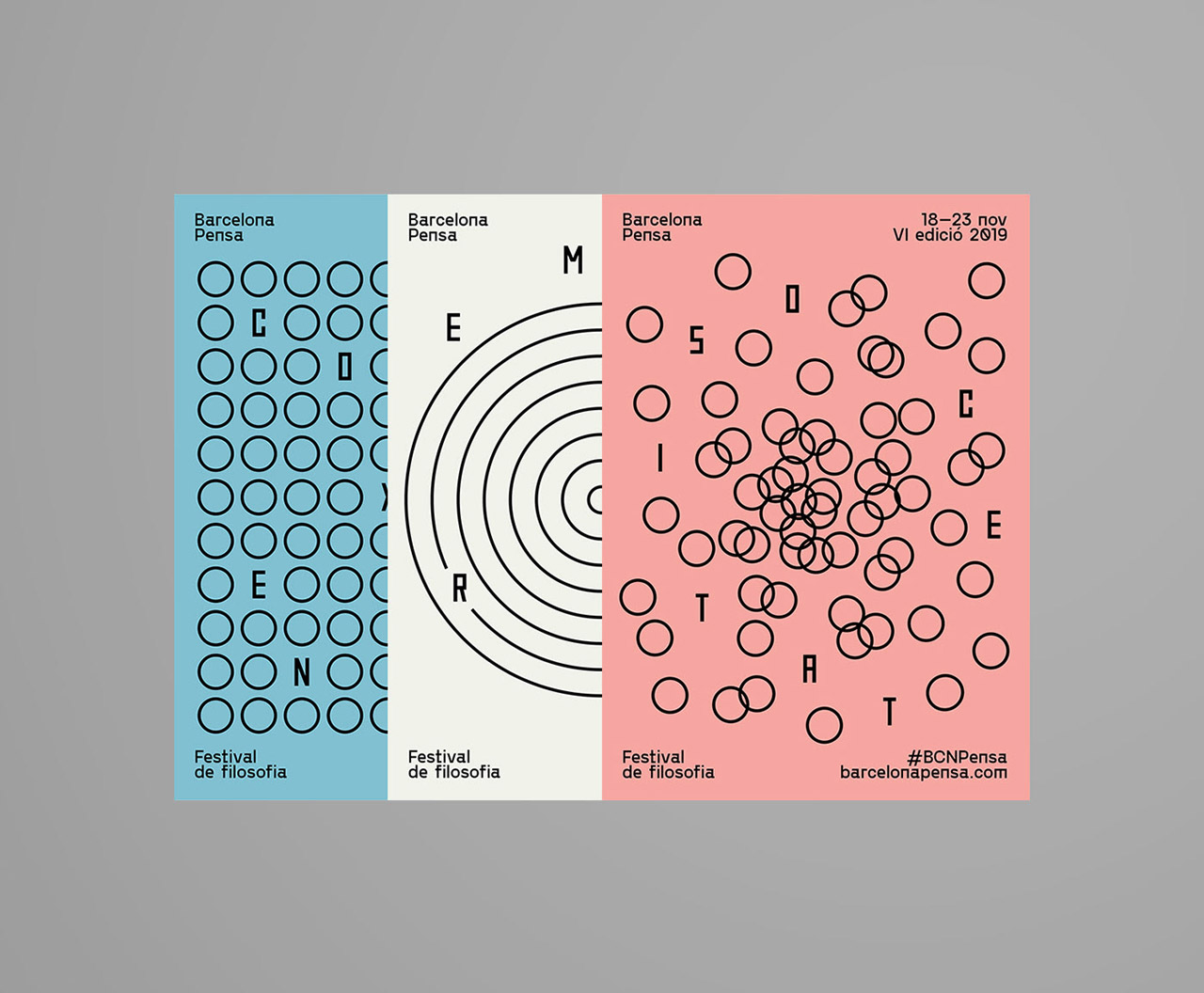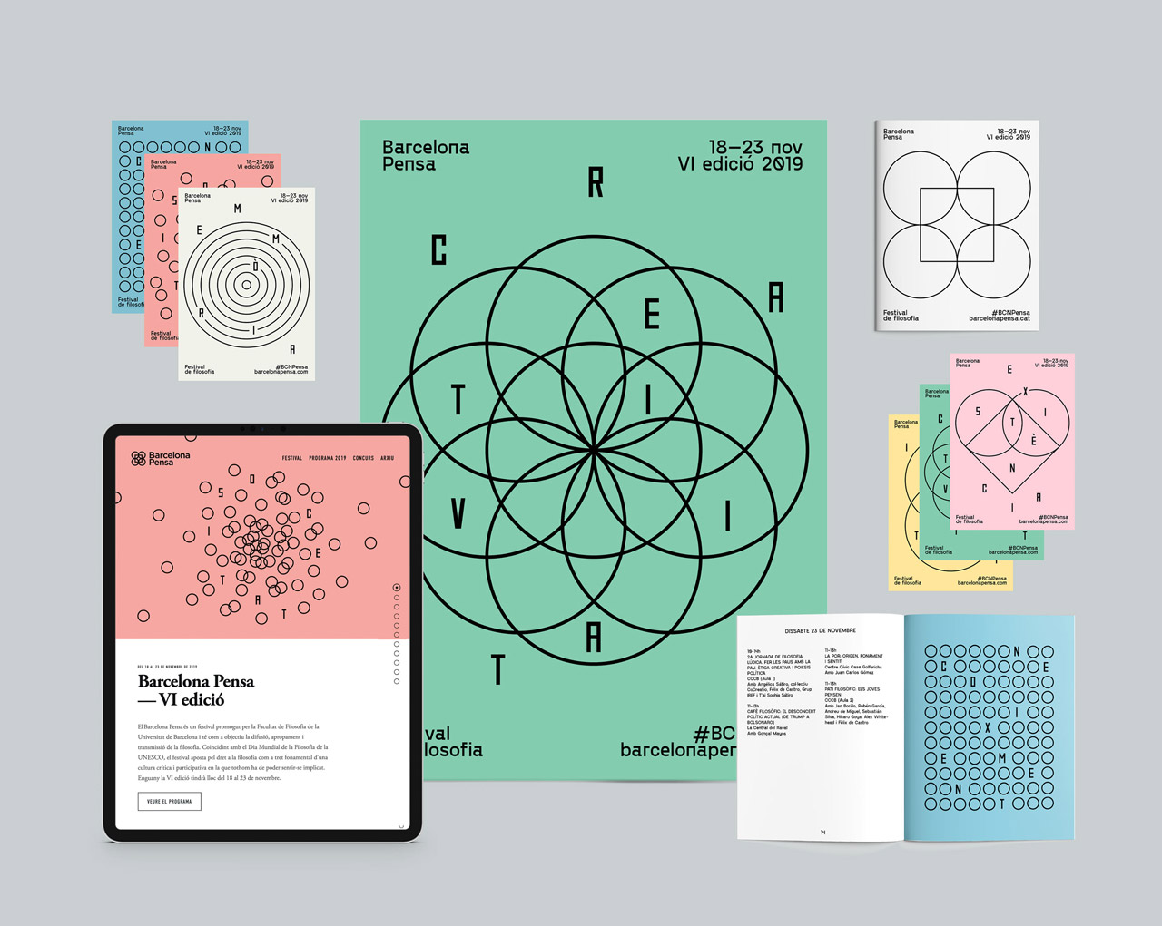A philosophy festival composed of many independent events. On the sixth edition of the film festival held in 2019, more than 40 events were held, divided into six main pillars, each with its own graphic representation to arouse reflection. These pillars are society, memory, equality, knowledge, existence and creativity. In addition to creating a print design, another brand promotion was also designed, including responsive websites, posters, postcards, and handbags.